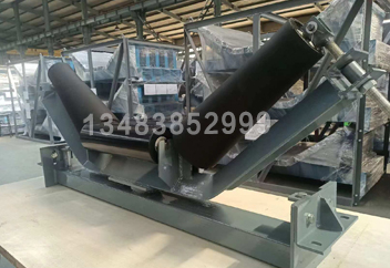 雙中輥調(diào)偏托輥組回轉(zhuǎn)軸焊在下橫梁上,回轉(zhuǎn)總成(包括組合軸承、回轉(zhuǎn)軸套)安裝在下橫梁上方,回轉(zhuǎn)總成外圍設(shè)計(jì)了可擺動(dòng)的中托輥橫梁,以回轉(zhuǎn)軸為中心,在運(yùn)行膠帶前、后中托輥橫梁上各設(shè)置一個(gè)中托輥,形成以回轉(zhuǎn)軸為中心的平衡支撐。側(cè)托輥采用加大軸承和軸徑設(shè)計(jì),用側(cè)托輥軸代替常規(guī)的側(cè)托輥橫梁功能。側(cè)托輥可拆卸的安裝在兩中輥中間。側(cè)托輥為錐形輥設(shè)計(jì),錐形輥采用鑄橡膠結(jié)構(gòu),其在膠帶跑偏時(shí)能產(chǎn)生較大的回向阻尼效果,從而使膠帶居中平穩(wěn)運(yùn)行。